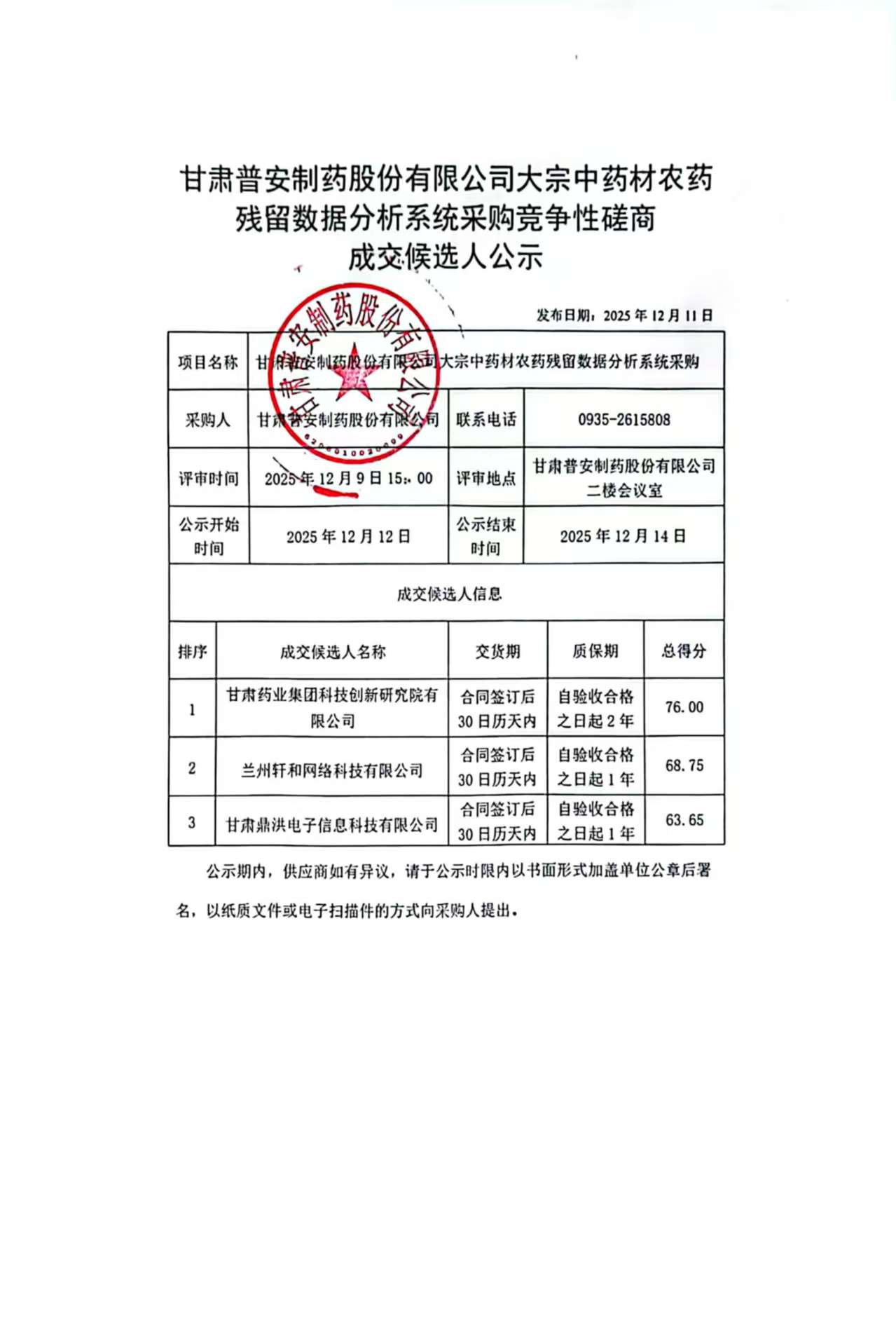 甘肃普安制药股份有限公司大宗中药材农药残留数据分析系统采购竞争性磋商成交候选人公示