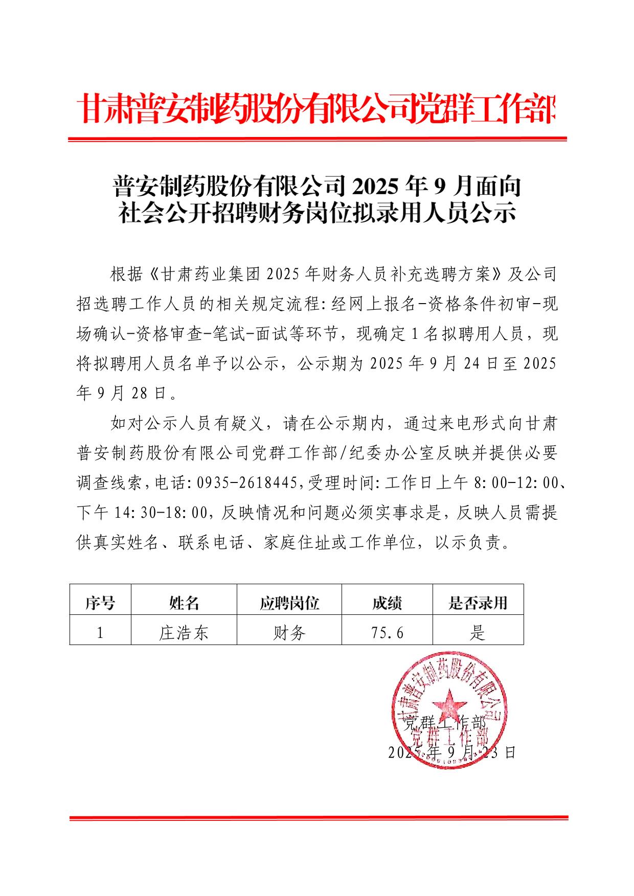 普安制药股份有限公司2025年9月面向社会公开招聘财务岗位拟录用人员公示