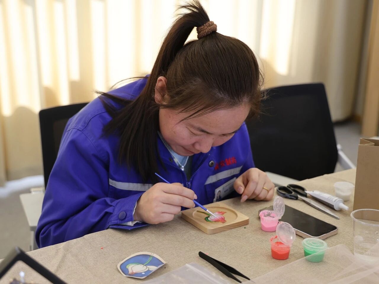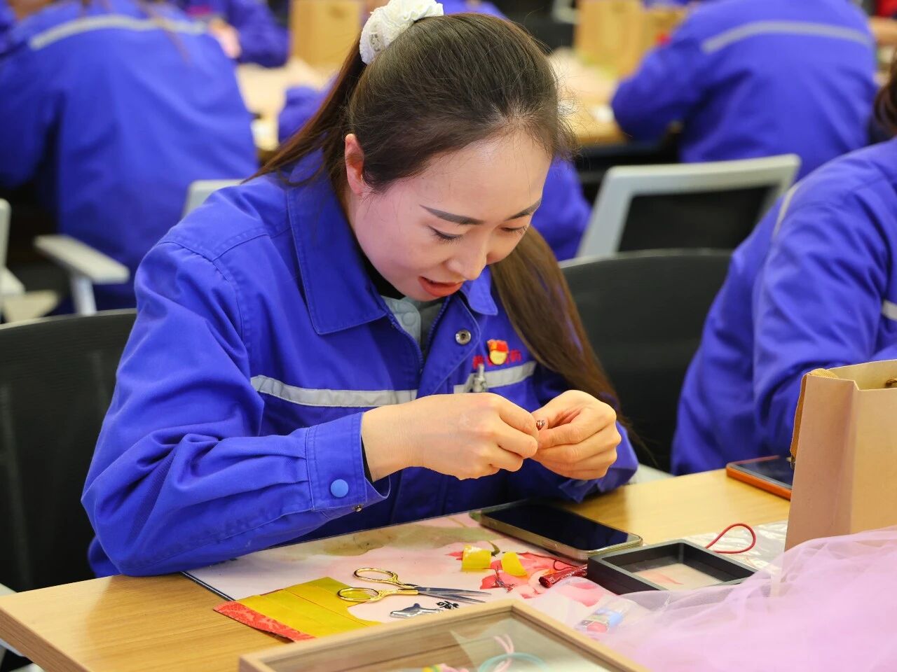 在手作体验环节,大家热情高涨、兴致盎然,纷纷化身“手作匠人”,在老师的悉心指导下,运用掐丝珐琅、宋锦、螺钿等特色材料,精心创作饰品、装饰画、团扇、杯垫等文创作品。大家凝神专注、穿针引线、细心雕琢,将匠心与巧思融入指尖创作,在动手实践中近距离感受传统工艺的独特魅力。现场氛围温馨和谐、欢声笑语不断,一件件精致美观、独具创意的手作作品陆续呈现,既展现了女职工心灵手巧、追求美好的精神风貌,也在互动交流中增进了情谊、舒缓了压力。