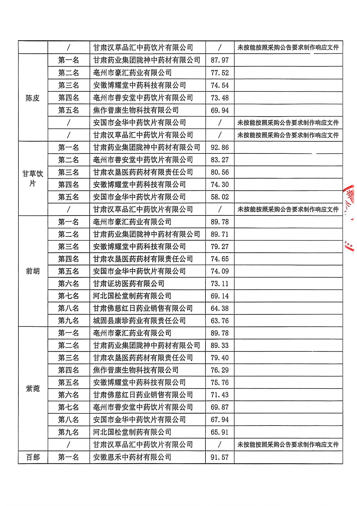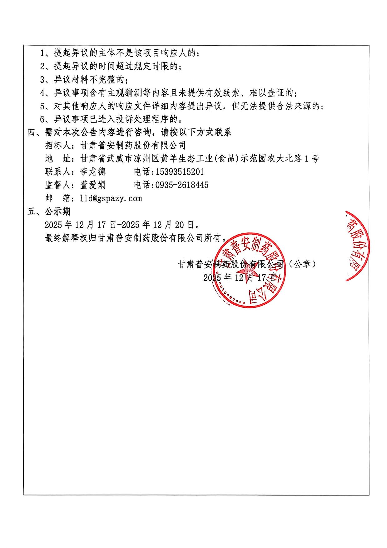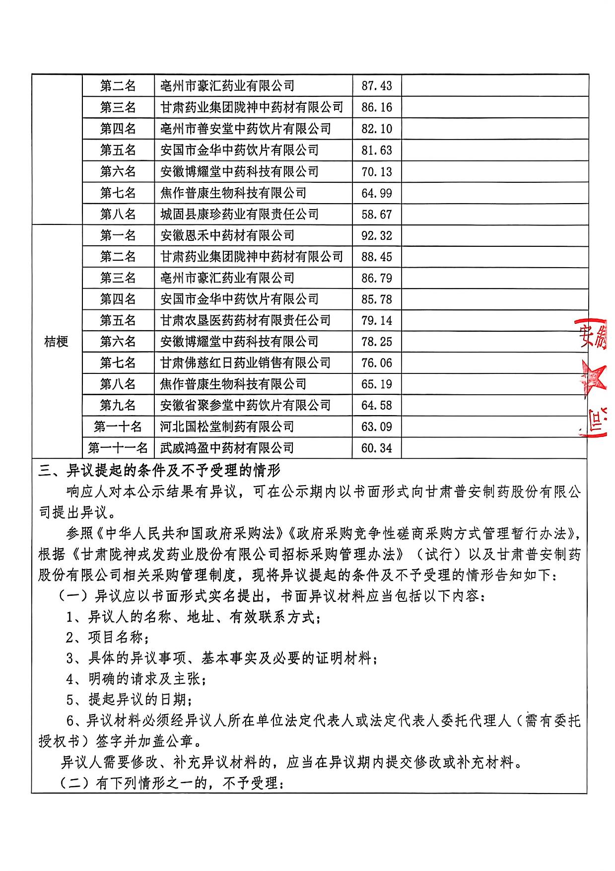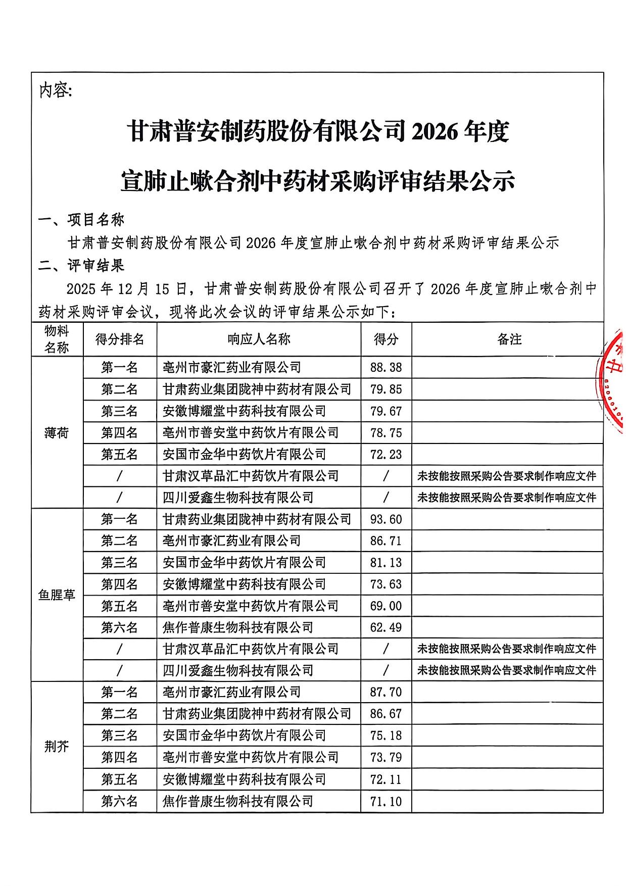 甘肃普安制药股份有限公司2026年度宣肺止嗽合剂中药材采购评审结果公示