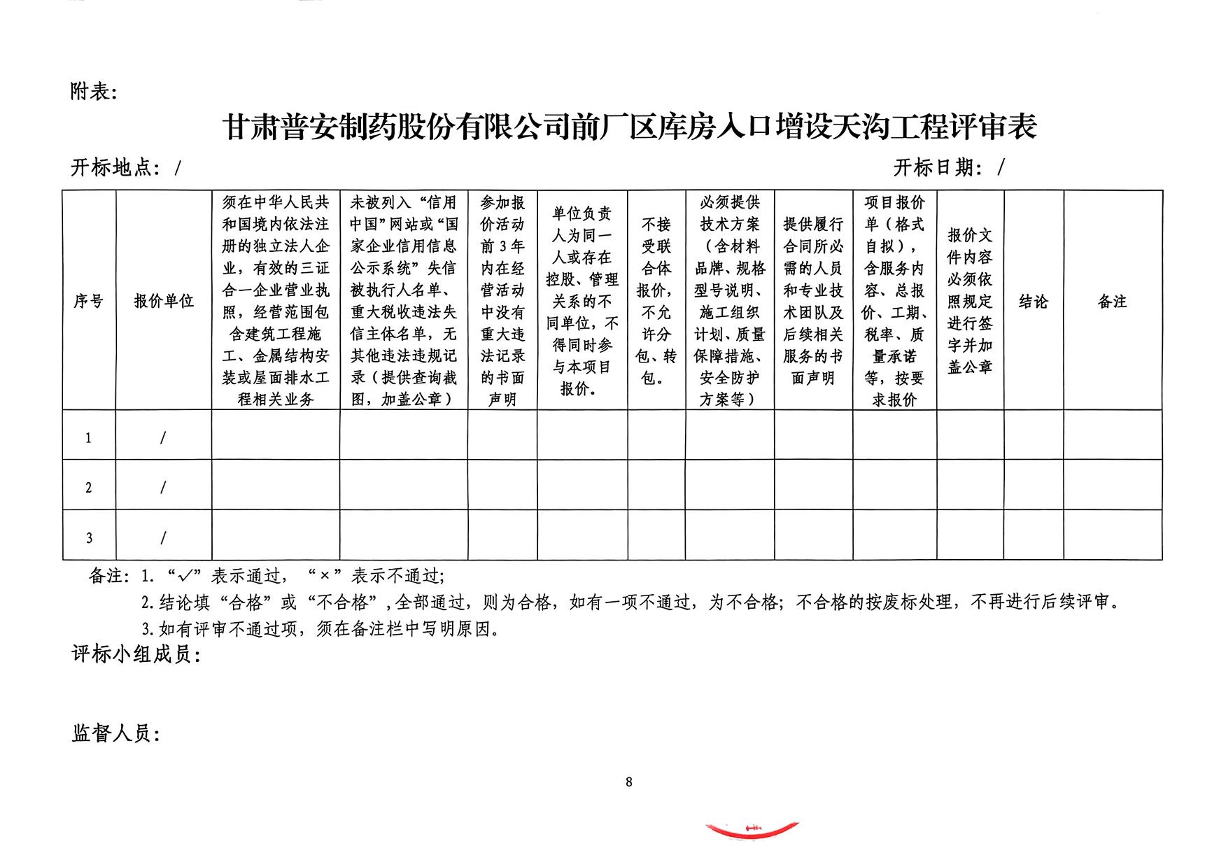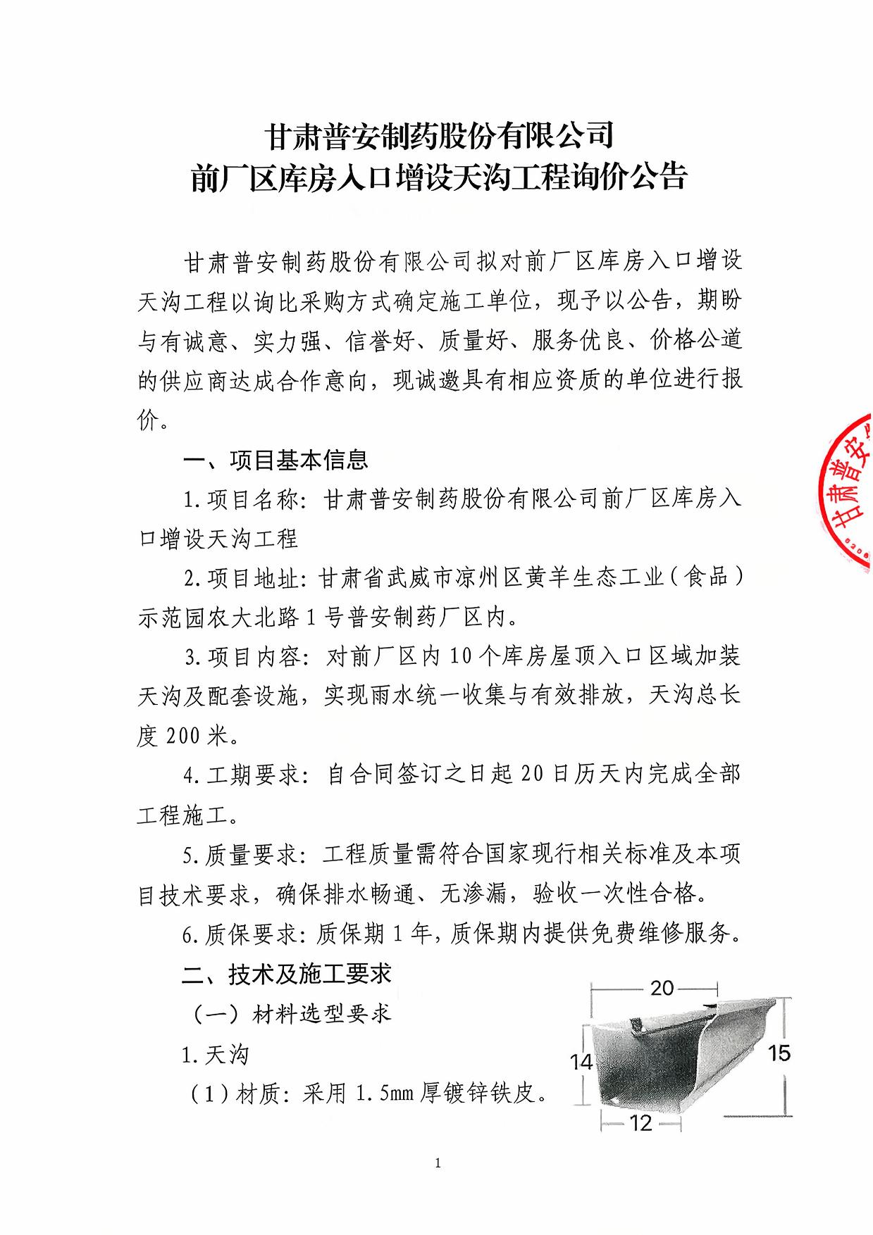 甘肃普安制药股份有限公司前厂区库房入口增设天沟工程询价公告