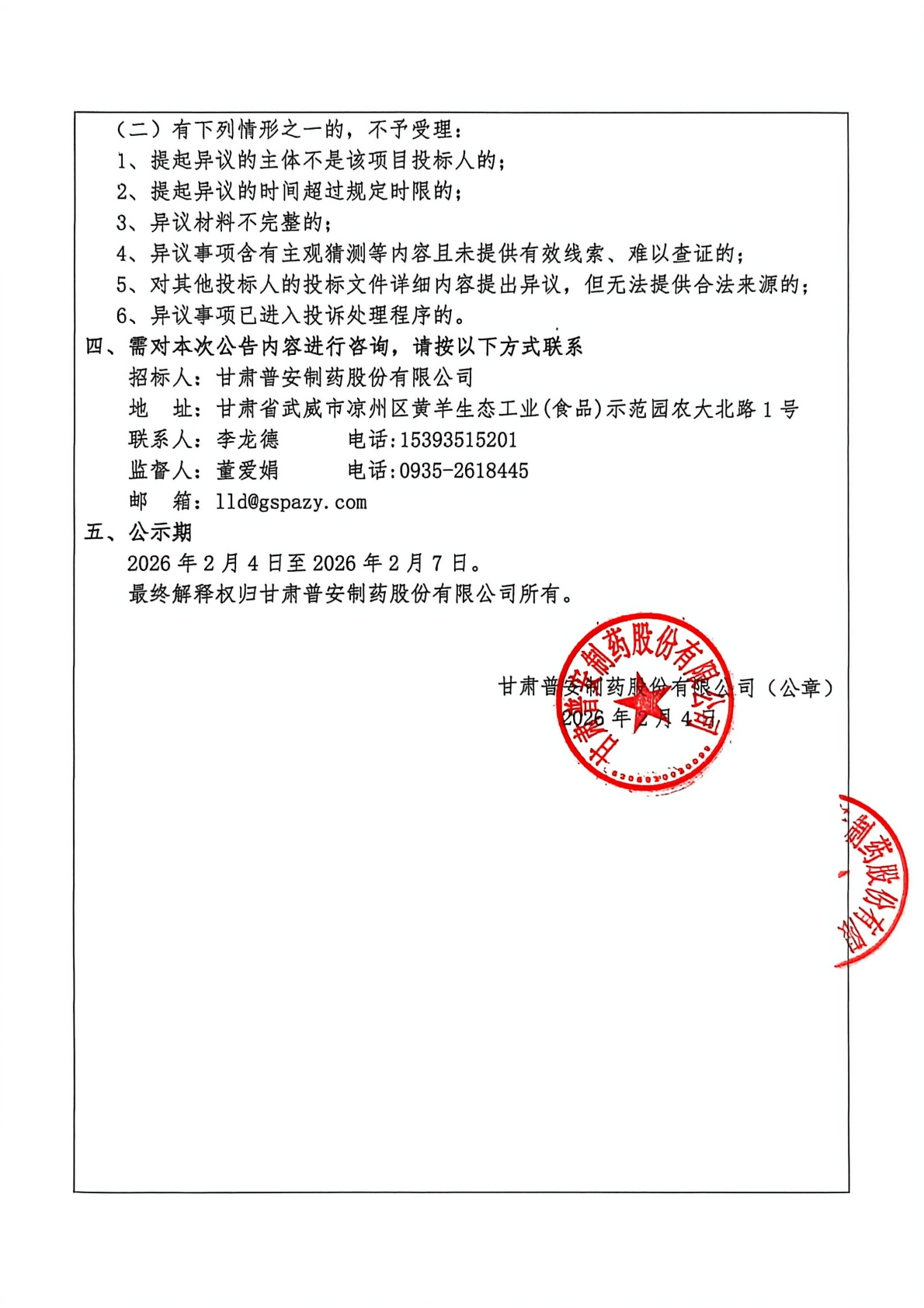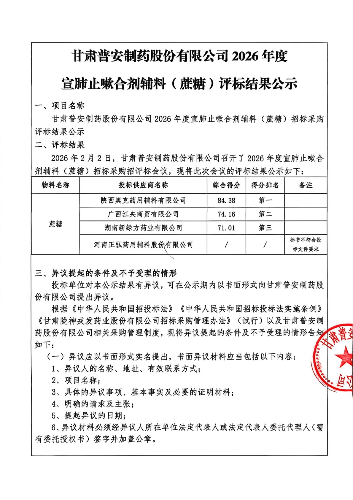 甘肃普安制药股份有限公司2026年度 宣肺止嗽合剂辅料(蔗糖)评标结果公示