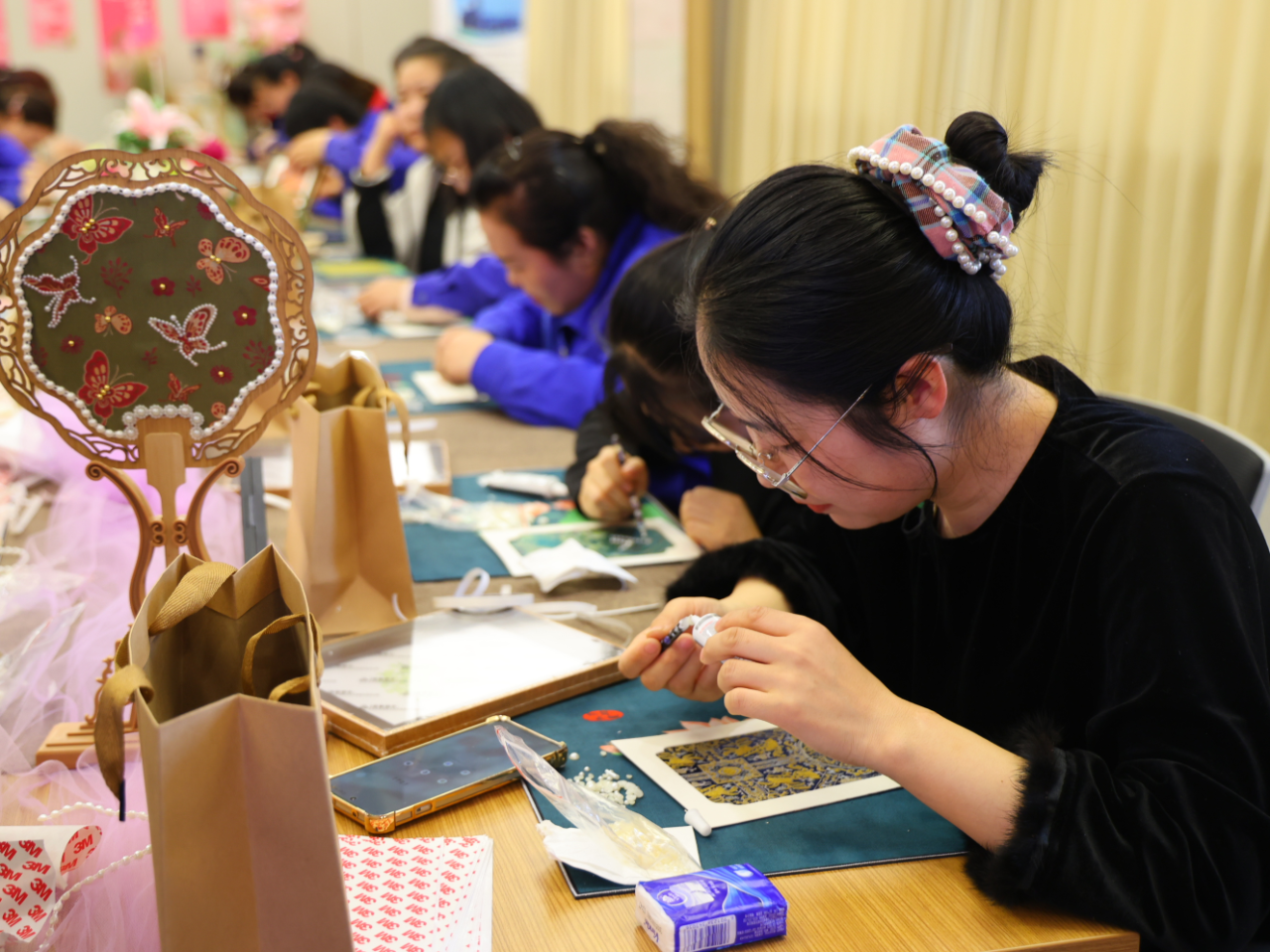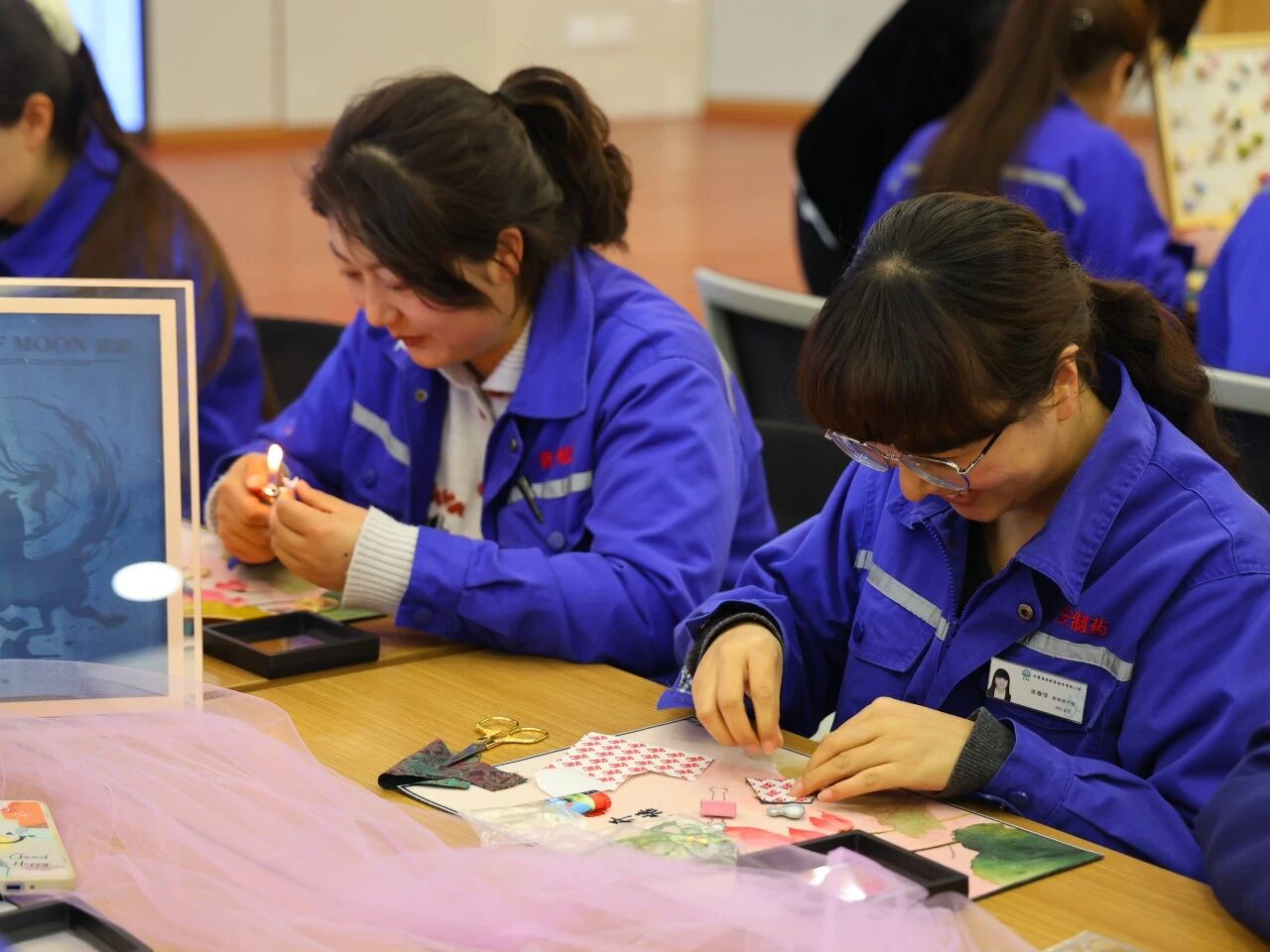 在手作体验环节,大家热情高涨、兴致盎然,纷纷化身“手作匠人”,在老师的悉心指导下,运用掐丝珐琅、宋锦、螺钿等特色材料,精心创作饰品、装饰画、团扇、杯垫等文创作品。大家凝神专注、穿针引线、细心雕琢,将匠心与巧思融入指尖创作,在动手实践中近距离感受传统工艺的独特魅力。现场氛围温馨和谐、欢声笑语不断,一件件精致美观、独具创意的手作作品陆续呈现,既展现了女职工心灵手巧、追求美好的精神风貌,也在互动交流中增进了情谊、舒缓了压力。